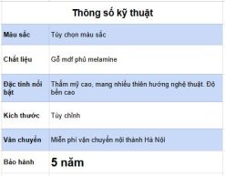 Chất liệu : Gỗ công nghiệp Malaysia phủ melamine, chất liệu gỗ tốt, không cong vênh mối mọt, độ dày 17 mm